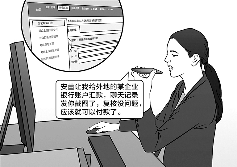 隨后,黃某某被拉入一個(gè)聊天群,并在該群收到備注名為安某某(該公司董事長(zhǎng))發(fā)來的消息,詢問黃某某是否接到銀行需要年檢的通知,并在聊天群中“安排公司相關(guān)工作”,這讓黃某某輕信了安某某的身份。隨即,安某某要求黃某某向外地某企業(yè)銀行賬戶匯款。